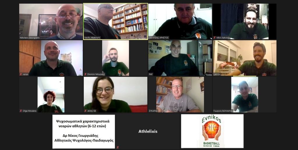 Αναμένοντας την αποκλιμάκωση των μέτρων ΓΙΑ ΤΙΣ ΑΘΛΗΤΙΚΕΣ ΔΡΑΣΤΗΡΙΟΤΗΤΕΣ ΤΩΝ ΣΩΜΑΤΕΙΩΝ, οι προπονητές του συλλόγου μας Εύνικος Γ.Α.Σ προετοιμάζονται όσο καλύτερα γίνεται και με τις επιμορφωτικές συναντήσεις με τον πολύτιμο συνεργάτη πλέον του συλλόγου μας Δρ. Γεωργιάδη Νίκο – Αθλητικό Ψυχολόγο – Παιδαγωγό Nikos Georgiadis ! Ευχές όλων μας για Καλό Πάσχα και Καλή Ανάσταση!Στην φωτογραφία μία από τις επιμορφωτικές τηλε-συναντήσεις με θέμα «Τα ψυχοσωματικά χαρακτηριστικά των νεαρών αθλητών (6-12 ετών)», συζητώντας και την αντιμετώπιση των ειδικών ζητημάτων που προκύπτουν από την πολύμηνη αποχή των αθλητών από οργανωμένη και έντονη άθληση.