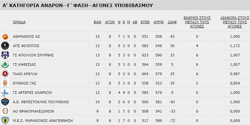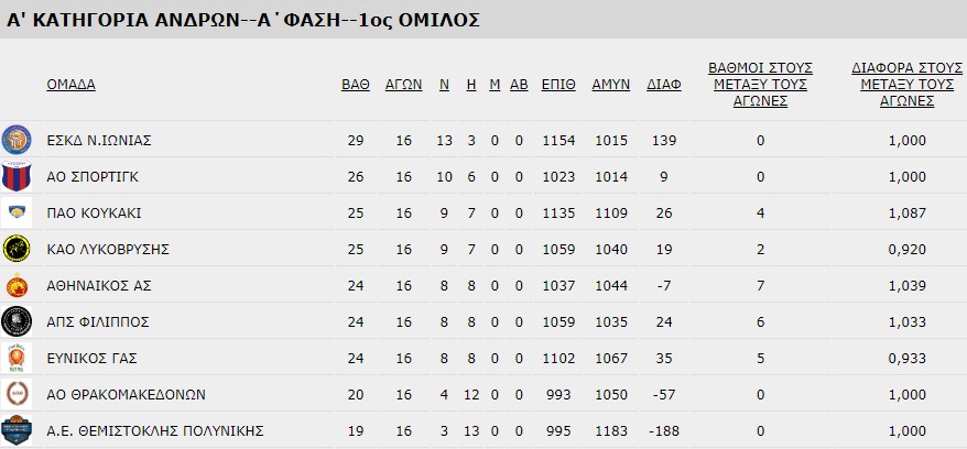 Η τελική βαθμολογία της Α’ φάσης στον 1ο όμιλο της Α’ ΕΣΚΑ