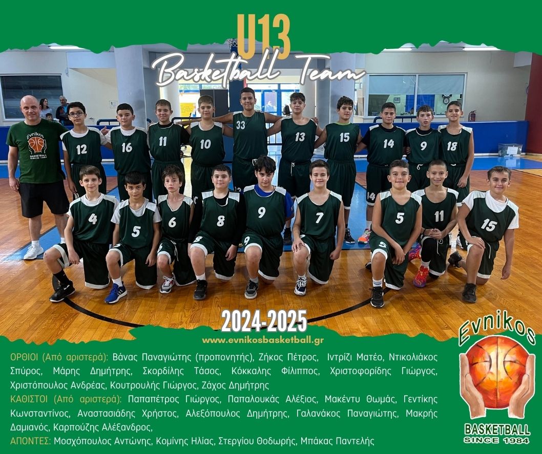 2024-2025 Εύνικος Γ.Α.Σ. Ομάδα Αγοριών U13 ΟΡΘΙΟΙ (Από αριστερά): Βάνας Παναγιώτης (προπονητής), Ζήκος Πέτρος, Ιντρίζι Ματέο, Ντικολιάκος Σπύρος, Μάρης Δημήτρης, Σκορδίλης Τάσος, Κόκκαλης Φίλιππος, Χριστοφορίδης Γιώργος, Χριστόπουλος Ανδρέας, Κουτρουλής Γιώργος, Ζάχος Δημήτρης ΚΑΘΙΣΤΟΙ (Από αριστερά): Παπαπέτρος Γιώργος, Παπαλουκάς Αλέξιος, Μακέντυ Θωμάς, Γεντίκης Κωνσταντίνος, Αναστασιάδης Χρήστος, Αλεξόπουλος Δημήτρης, Γαλανάκος Παναγιώτης, Μακρής Δαμιανός, Καρπούζης Αλέξανδρος, ΑΠΟΝΤΕΣ: Μοσχόπουλος Αντώνης, Κομίνης Ηλίας, Στεργίου Θοδωρής, Μπάκας Παντελής