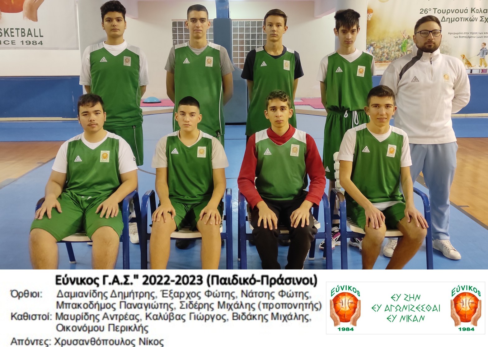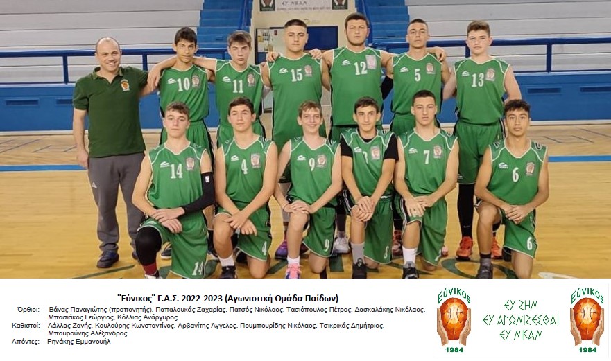 ¨Εύνικος¨ Γ.Α.Σ. 2022-2023 (Αγωνιστική Ομάδα Παίδων) Όρθιοι: Βάνας Παναγιώτης (προπονητής), Παπαλουκάς Ζαχαρίας, Πατσός Νικόλαος, Τασιόπουλος Πέτρος, Δασκαλάκης Νικόλαος, Μπασιάκος Γεώργιος, Κόλλιας Ανάργυρος Καθιστοί: Λάλλας Ζανής, Κουλούρης Κωνσταντίνος, Αρβανίτης Άγγελος, Πουμπουρίδης Νικόλαος, Τσικρικάς Δημήτριος, Μπουρούνης Αλέξανδρος Απόντες: Ρηνάκης Εμμανουήλ