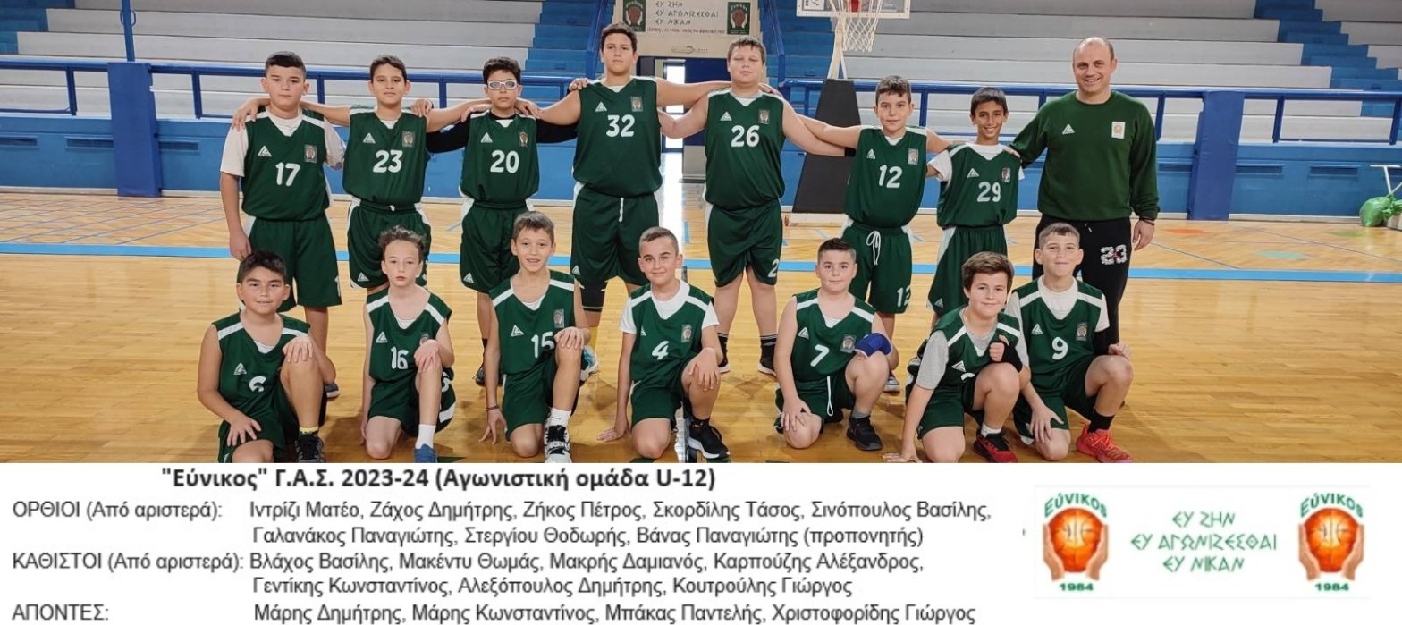 «Εύνικος» Γ.Α.Σ. 2023-2024, U-12ΟΡΘΙΟΙ (Από αριστερά): Ιντρίζι Ματέο, Ζάχος Δημήτρης, Ζήκος Πέτρος, Σκορδίλης Τάσος, Σινόπουλος Βασίλης, Γαλανάκος Παναγιώτης, Στεργίου Θοδωρής, Βάνας Παναγιώτης (προπονητής).ΚΑΘΙΣΤΟΙ (Από αριστερά): Βλάχος Βασίλης, Μακέντυ Θωμάς, Μακρής Δαμιανός, Καρπούζης Αλέξανδρος, Γεντίκης Κωνσταντίνος, Αλεξόπουλος Δημήτρης, Κουτρούλης Γιώργος.ΑΠΟΝΤΕΣ: Μάρης Δημήτρης, Μάρης Κωνσταντίνος, Μπάκας Παντελής, Χριστοφορίδης Γιώργος.