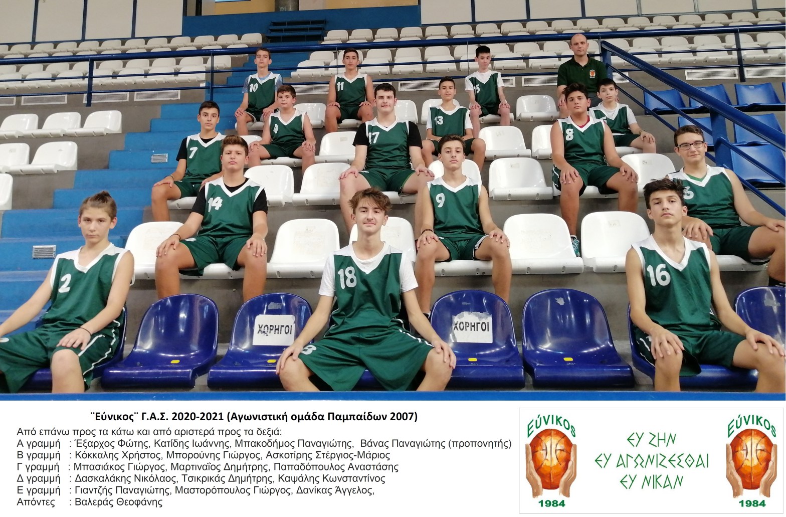 Από επάνω προς τα κάτω και από αριστερά προς τα δεξιά: Α γραμμή : Έξαρχος Φώτης, Κατίδης Ιωάννης, Μπακοδήμος Παναγιώτης, Βάνας Παναγιώτης (προπονητής) Β γραμμή : Κόκκαλης Χρήστος, Μπορούνης Γιώργος, Ασκοτίρης Στέργιος-Μάριος Γ γραμμή : Μπασιάκος Γιώργος, Μαρτιναΐος Δημήτρης, Παπαδόπουλος Αναστάσης Δ γραμμή : Δασκαλάκης Νικόλαος, Τσικρικάς Δημήτρης, Καψάλης Κωνσταντίνος Ε γραμμή : Γιαντζής Παναγιώτης, Μαστορόπουλος Γιώργος, Δανίκας Άγγελος, Απόντες : Βαλεράς Θεοφάνης